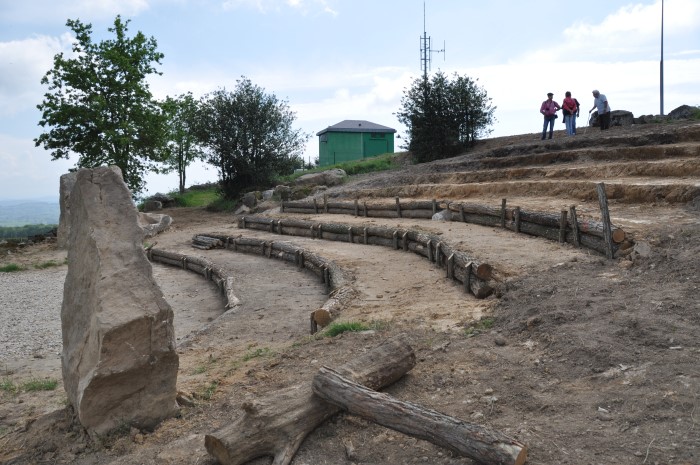 Joël Jouve, président du comité des fêtes, explique : « nous en avons redressé 3, dont l’un pèse plus de 3 tonnes (vérifié par instrument électronique de mesure), que l’on voit sur les photos de part et d’autre de la future scène et un autre situé tout en haut des gradins, encore plus remarquablement taillé dont la partie supérieure semble refléter une esquisse de tête. »
